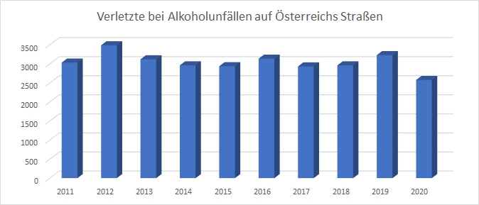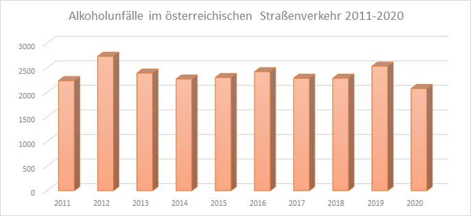 Die folgende Statistik zeigt die Anzahl der Alkoholunfälle im Straßenverkehr in den Jahren 2011 bis 2020. Man kann erkennen, dass jährlich ca. 2.000-2.700 Unfälle im Straßenverkehr passieren, bei denen Alkohol im Spiel ist. Quelle: Statistik Austria